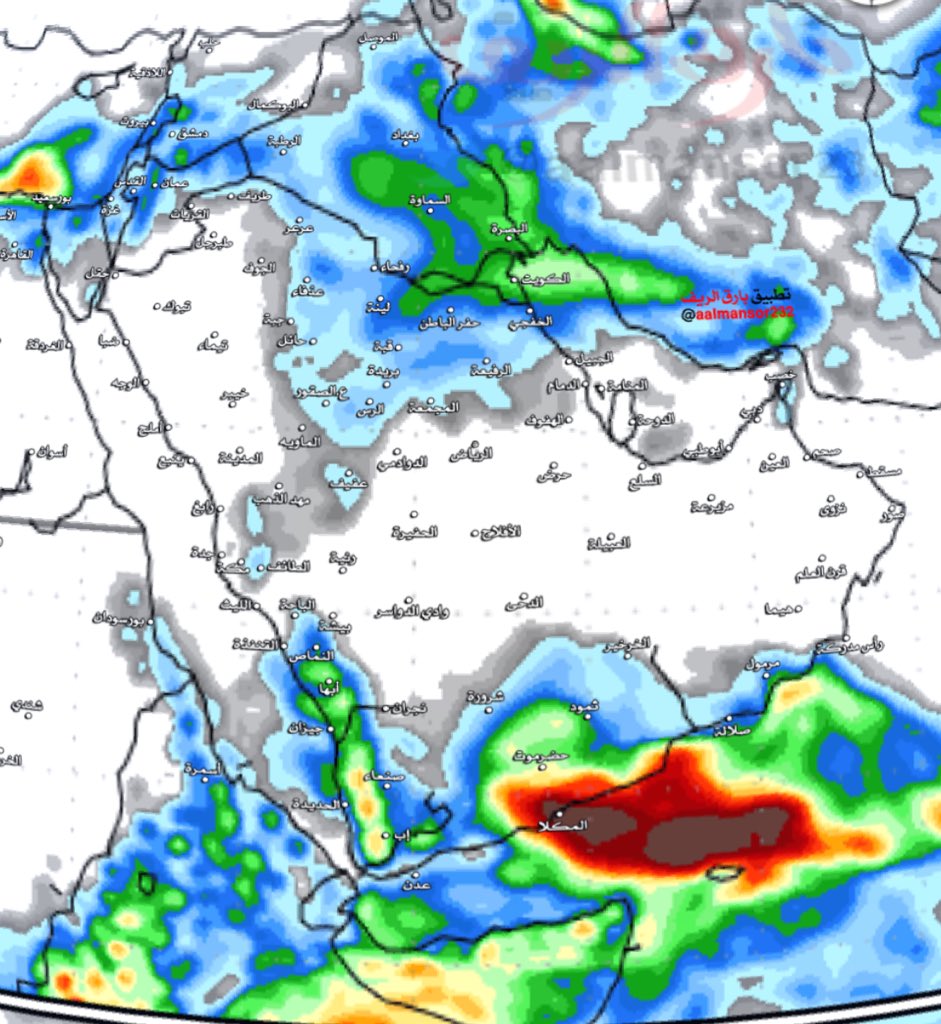 توقعات وكالة ناسا للأمطار بإذن الله للأسبوع الثاني ي شير لاستمرار واتساع نطاق الأمطار لأجواء المملكة والخليج